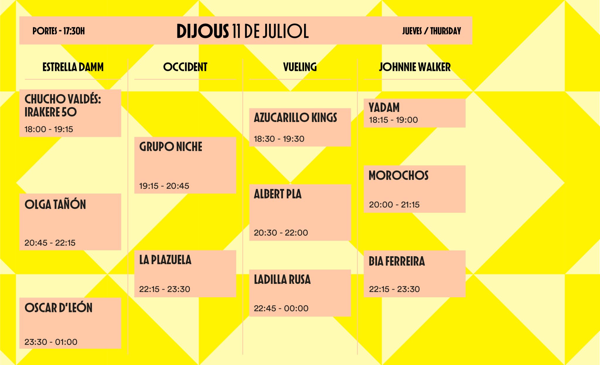 La segunda noche del festival, el 11 de julio, combinará los mitos latinos y la rumba canalla, el cóctel perfecto para consagrar una gran jornada al baile. El escenario Estrella Damm acogerá a grandes nombres de la música latina como Oscar D’León, Olga Tañón o Chucho Valdés, y el escenario Vueling se llenará de fiesta en manos de Ladilla Rusa o Albert Pla, entre otros.