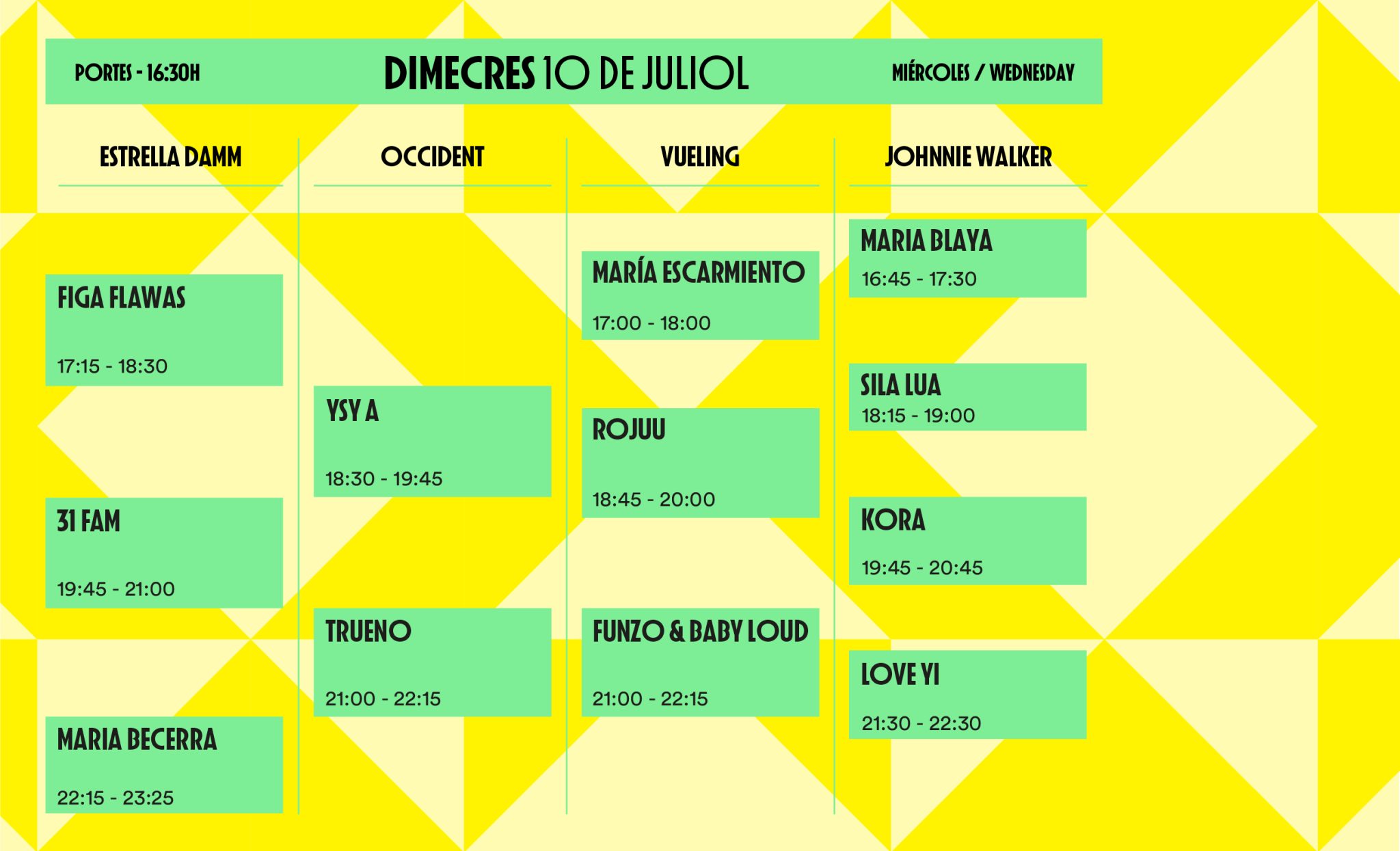 El Festival arrancará el miércoles 10 de julio con una primera noche de música más urbana dedicada al público más joven, donde se podrán ver grandes grupos referentes de este estilo como Maria Becerra, Figa Flawas y 31 FAM, en el escenario Estrella Damm, o Trueno y YSY En el escenario Occident. También se podrá disfrutar de Funzo & Baby Loud, María Escarmiento, Rojuu, Kora o Love YI, que estarán repartidos entre los escenarios Vueling y Johnny Walker.