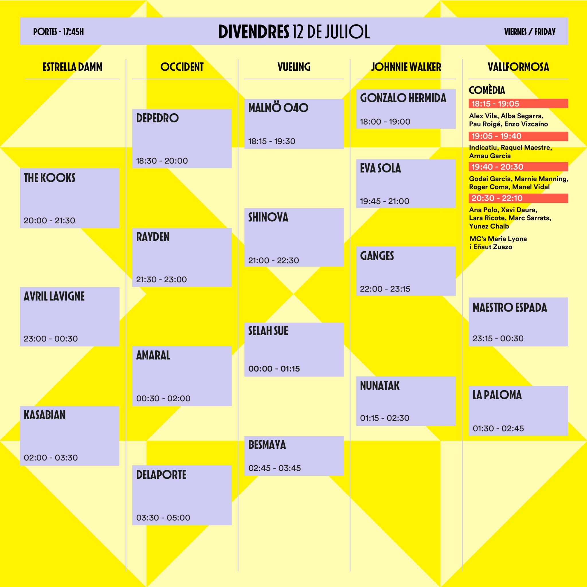 Al día siguiente, el viernes día 12, será una noche dominada por las melodías más pop-rock e indie donde podremos ver a artistas con largo bagaje, sobre todo en los escenarios Estrella Damm y Occident, donde subirán grandes nombres como Avril Lavigne, Kasabian, The Kooks o Amaral. En el escenario Vueling se podrá disfrutar de las actuaciones de Selah Sue o Shinova.